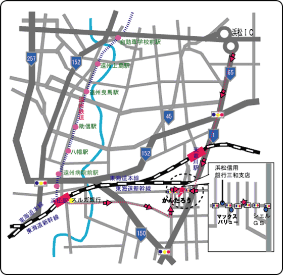 浜松インターチェンジより国道一号線に入り名古屋・豊橋方面に向かい新幹線のガードをくぐり100m先の信号を右折し2つ目の信号機の角にあります。